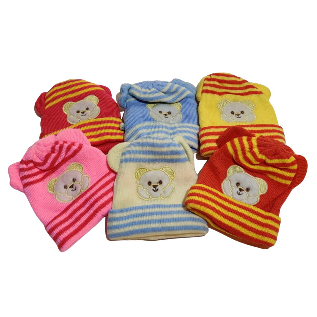 Partij van 40 warme kindermutsen met beren motief in diverse kleuren, fijn gebreid.