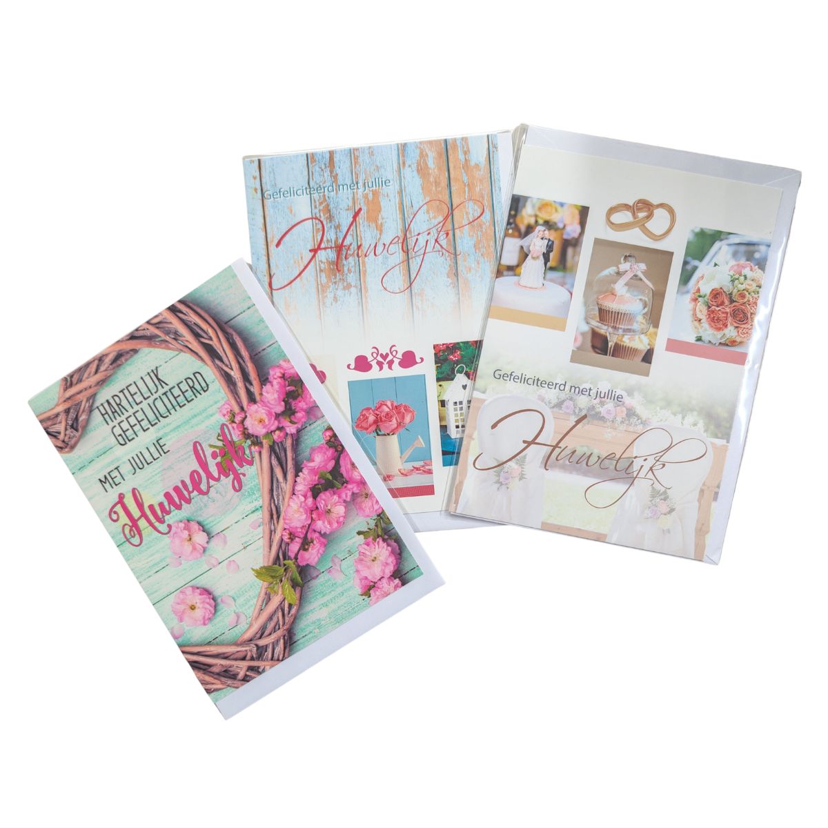 3 verschillende felicitatiekaarten voor een huwelijk, dubbel met envelop.